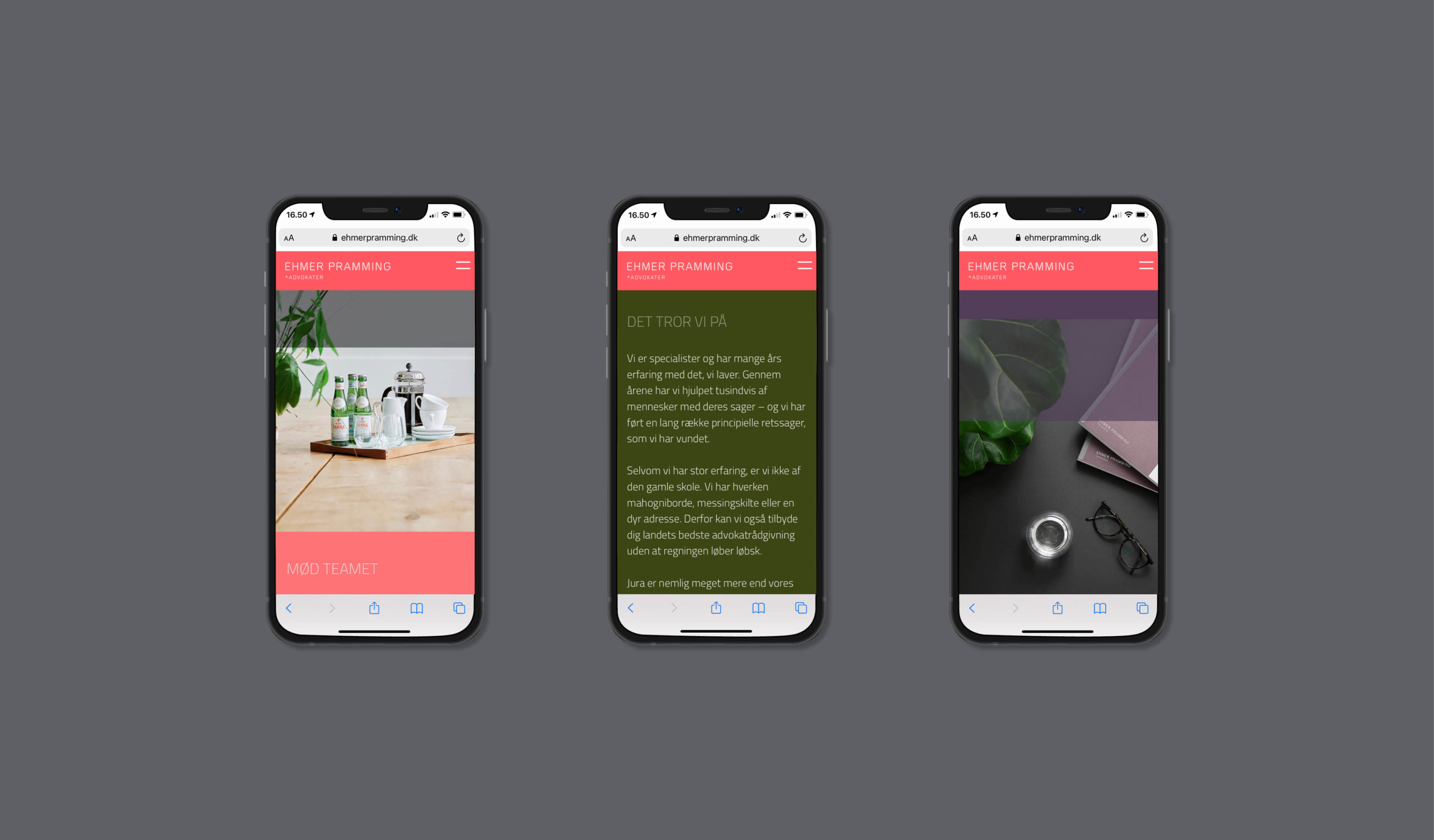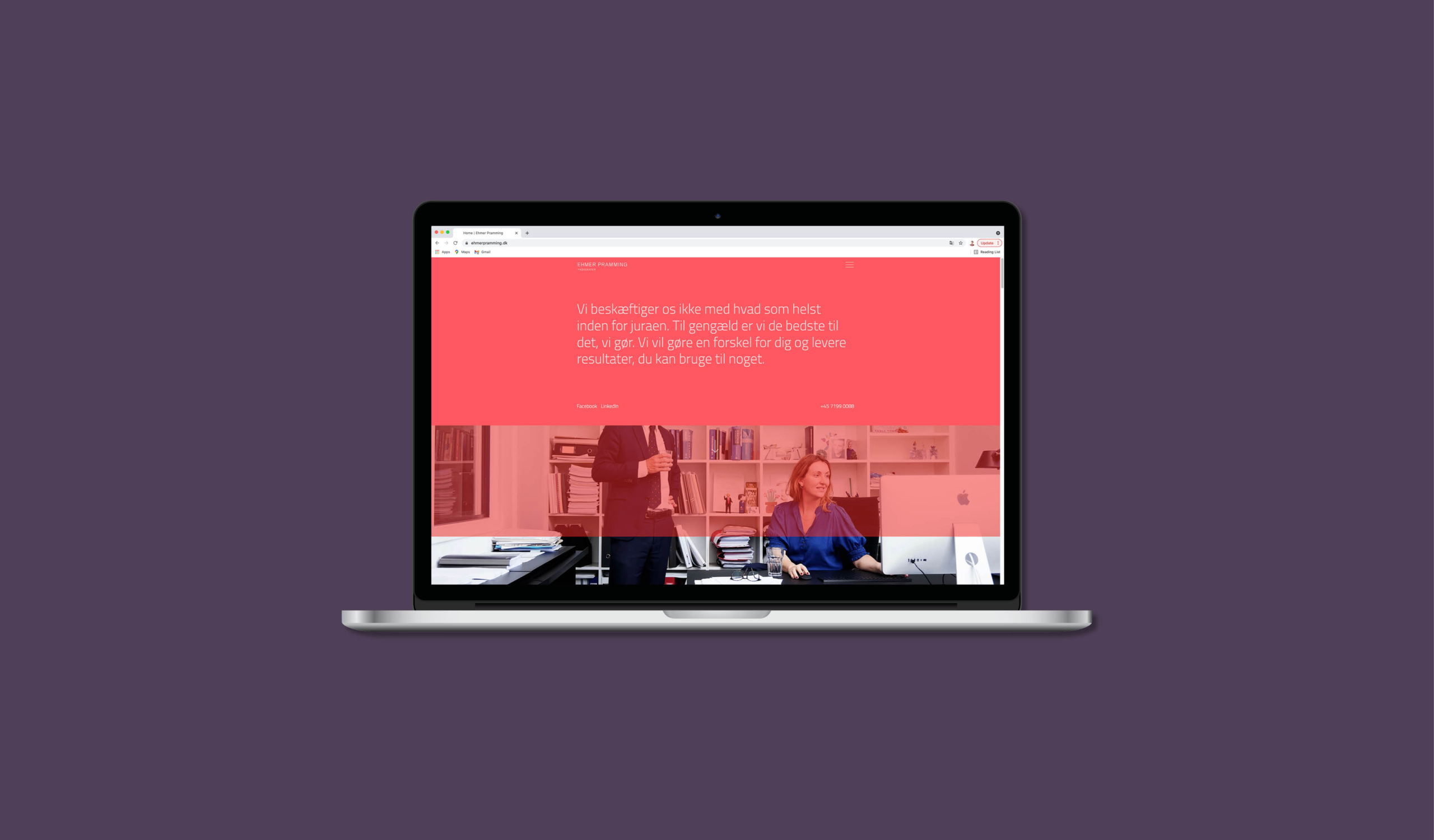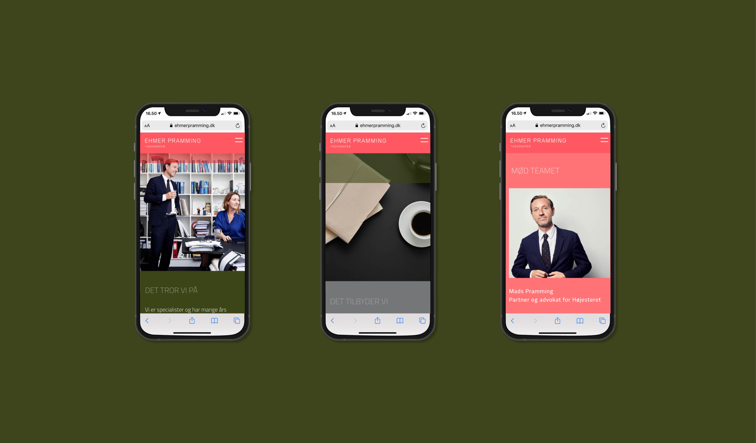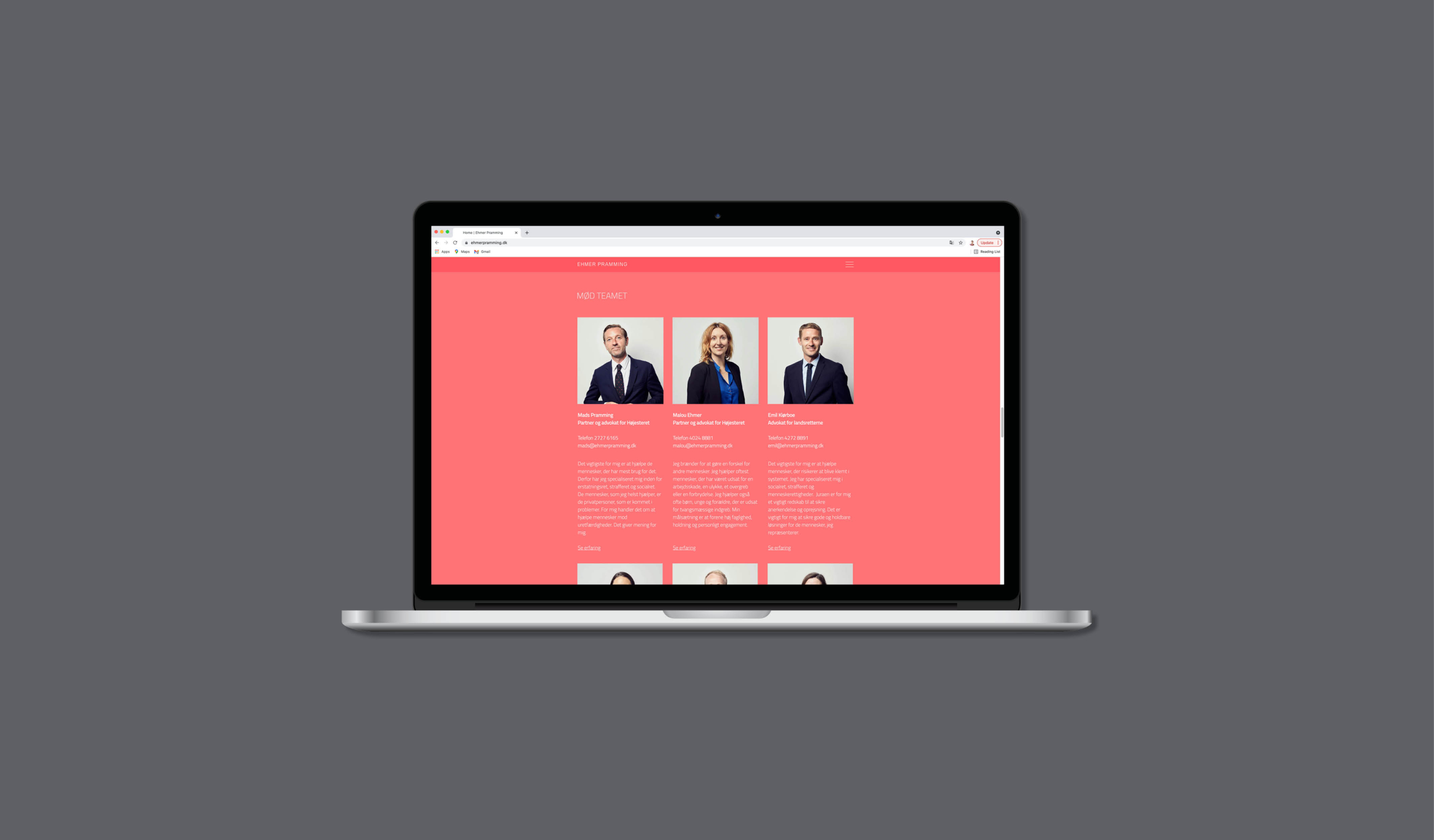Sofie har i 2021 stået for en opdatering af vores website og brand. Som altid forstår Sofie, hvor vi gerne vil hen, og hvad vi gerne vil udtrykke. Samtidig udfordrer hun os i forhold til det visuelle udtryk og gør os mere modige. Endnu engang er vi imponerede over Sofies ”blik”, og endnu en gang er vi super glade for resultatet. Vi har fået et visuelt udtryk, som rammer vores profil 100 % i forhold til vores klienter og samarbejdspartnere. Vores branche er meget konservativ, og vi ønsker at gå helt nye veje med et design, som afspejler, hvem vi er, og hvad vi står for. / Malou Ehmer (H) advokat, partner hos Ehmer Pramming.