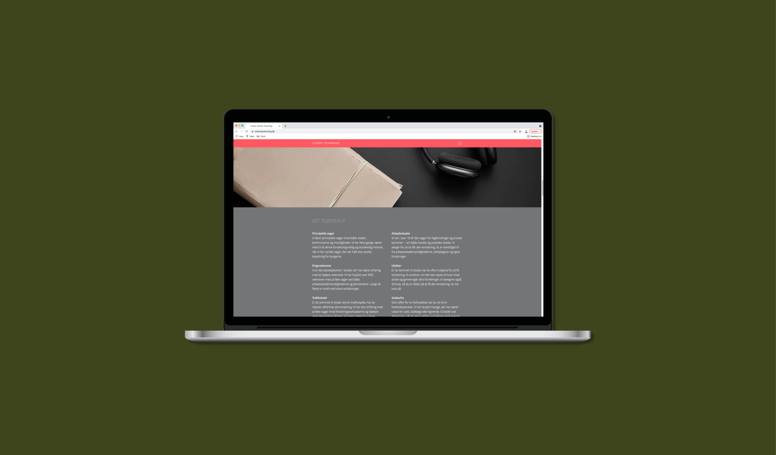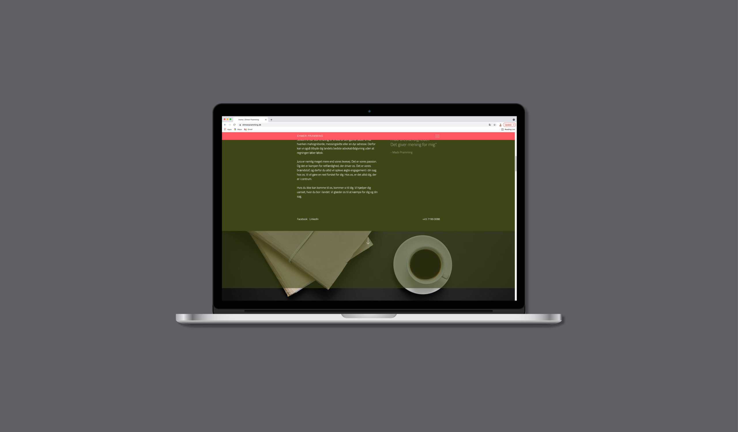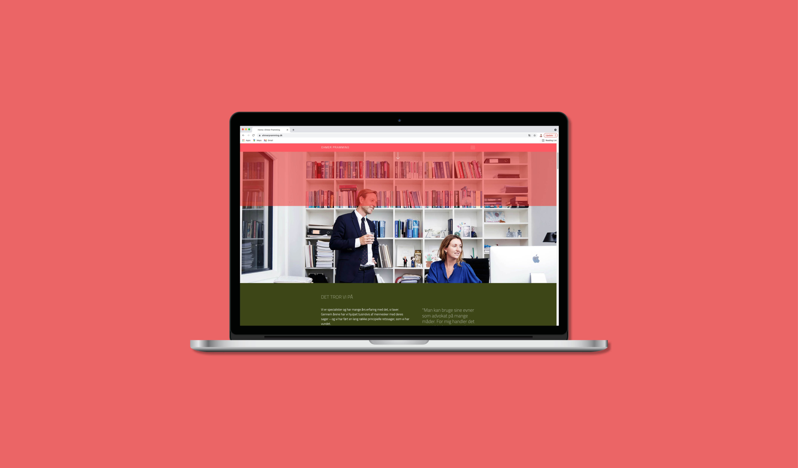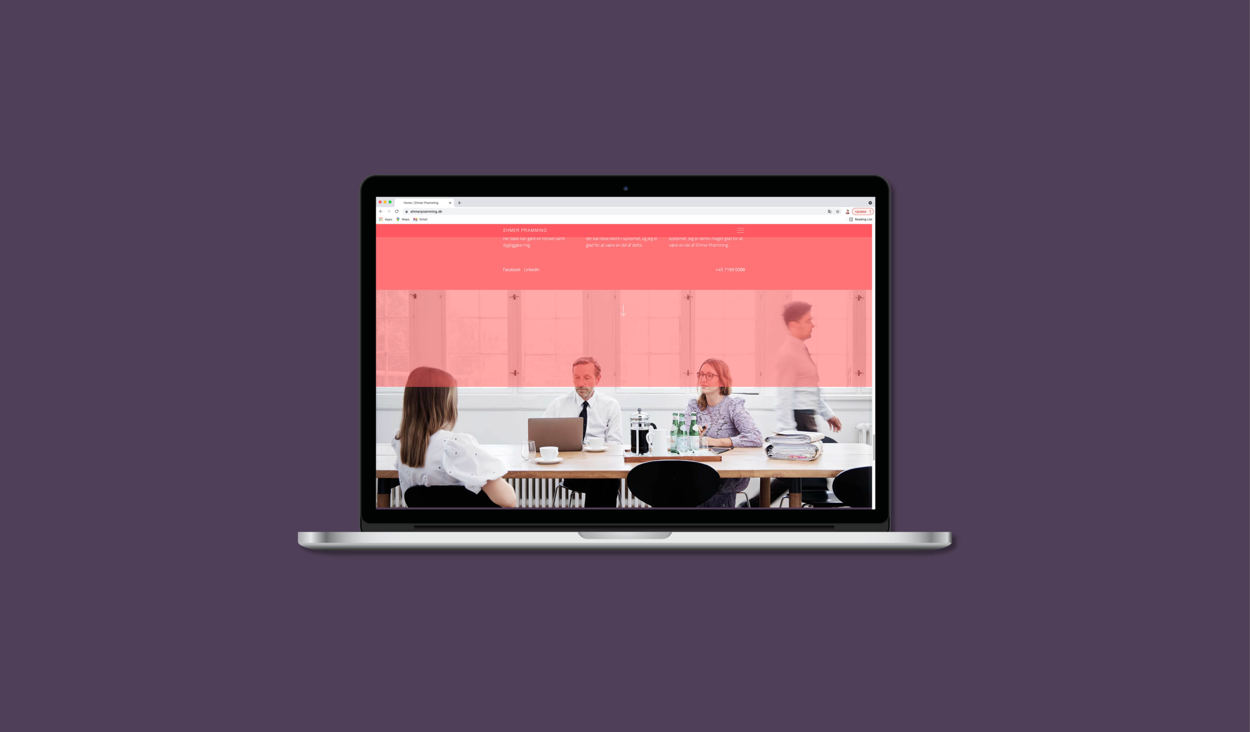 Sofie har i 2021 stået for en opdatering af vores website og brand. Som altid forstår Sofie, hvor vi gerne vil hen, og hvad vi gerne vil udtrykke. Samtidig udfordrer hun os i forhold til det visuelle udtryk og gør os mere modige. Endnu engang er vi imponerede over Sofies ”blik”, og endnu en gang er vi super glade for resultatet. Vi har fået et visuelt udtryk, som rammer vores profil 100 % i forhold til vores klienter og samarbejdspartnere. Vores branche er meget konservativ, og vi ønsker at gå helt nye veje med et design, som afspejler, hvem vi er, og hvad vi står for. / Malou Ehmer (H) advokat, partner hos Ehmer Pramming.